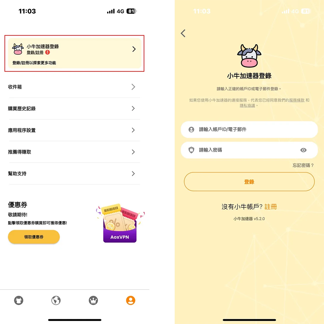 轉到您裝置上的小牛加速器應用程序,然後在帳戶頁面查看您的帳戶 ID。此帳戶 ID 與您的網站帳戶 ID 不同。點擊帳戶詳情橫幅進入帳戶設定頁面。
